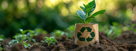 Green recycling symbol rising from dark fertile soil with small green seedlings growing around it. Representing eco friendly practices and sustainable waste management for environmental conservation