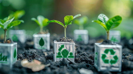 Young seedlings growing from eco-friendly blocks with sustainability symbols, representing green growth and environmental conservation.