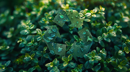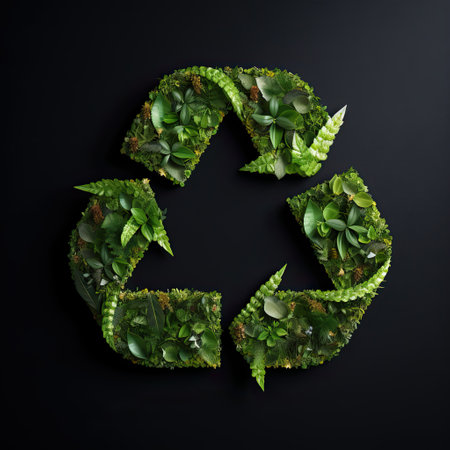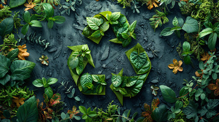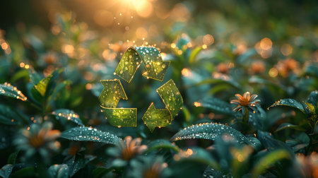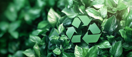 A green recycling symbol blends seamlessly with vibrant foliage, highlighting the importance of nature and sustainability.