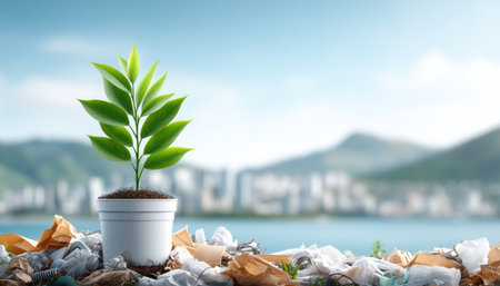 Young green plant white pot grows amid litter shoreline, hopeful environmental concept blending nature recovery and urban backdrop with soft