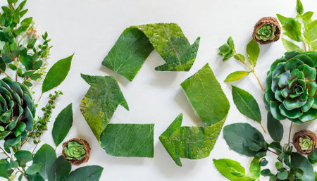 A visually appealing banner featuring a green recycling symbol creatively formed with lush leaves and nature-inspired details, set against a minimalist white background to promote eco-conscious