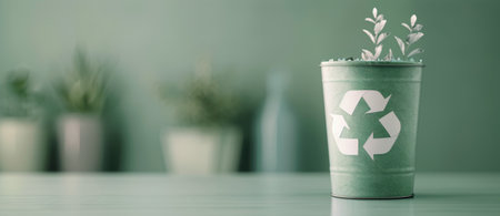 A small metallic container featuring a recycling symbol holds young green plants, highlighting the theme of sustainability amidst a soft, blurred green backdrop.