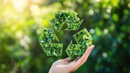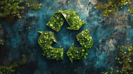 A vibrant green recycling symbol formed from lush leaves and nature-inspired elements, set against a white background. Perfect for promoting eco-conscious values, green living, and