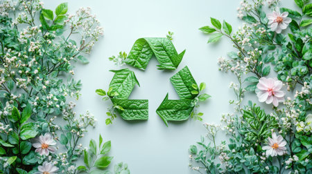 A recycling symbol made of green leaves and flowers on a light green background. Represents reusing waste materials for sustainability. Promotes environmental responsibility.