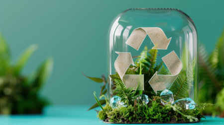 This image showcases an eco-friendly concept featuring a recycle symbol encased in a glass dome, surrounded by lush green plants and natural elements.