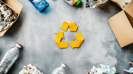 Green recycling emblem encompassing recyclable items such as aluminum foil and cardboard packaging, advocating for waste reduction and recycling initiatives