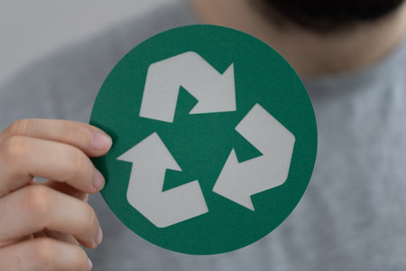 A vibrant green backdrop of leaves featuring an eco-friendly recycling symbol. This image represents sustainability, nature conservation, and a commitment to a greener planet.