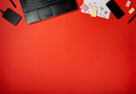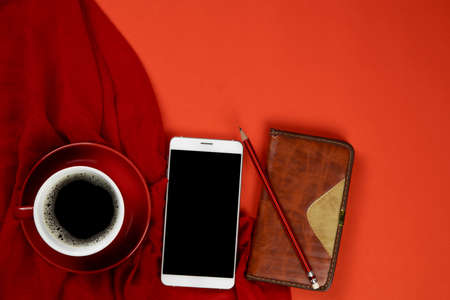 Background of red with smartphone, notebook and a cup of coffee