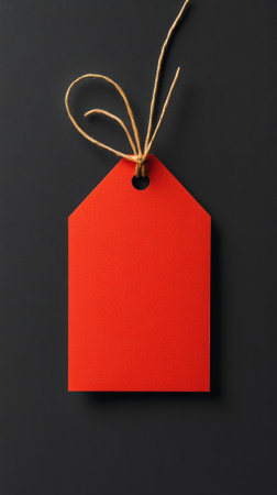 A vibrant red tag rests against a textured black backdrop, showing a clean and minimalistic design. The contrast emphasizes its shape and color, inviting curiosity.