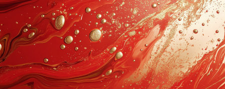 A bold red and gold oil liquid splash in sharp contrast, with scattered droplets forming intricate patterns.