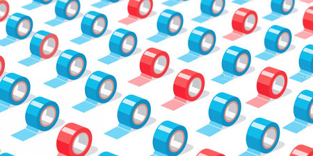 A repeating pattern of red and blue tape rolls arranged diagonally with shadows on a white background.