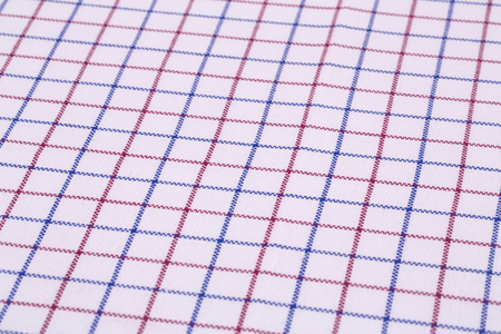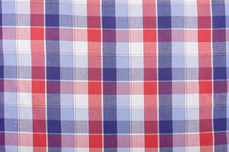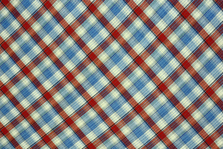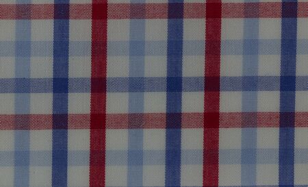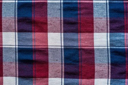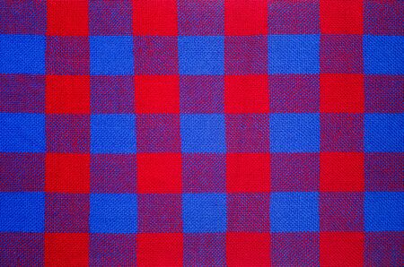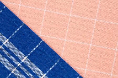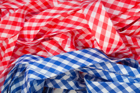 Plaid table napkins, white background. Collection of red and blue checkered tablecloth on white background close up. Row of vintage table napkins.
