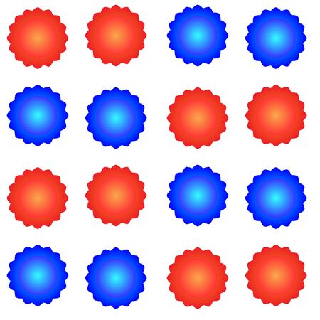 Brightly hued, reflective buttons in red, white, and blue form a lively, whimsical display on a blue backdrop, showing diverse sizes and a cheerful pattern.