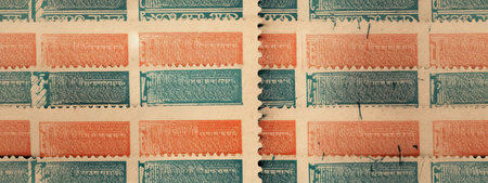 Vintage colorful postage stamp grunge background texture template. engraved halftone pattern with perforated stamp border frame. Retro antique postage concept backdrop or wallpaper