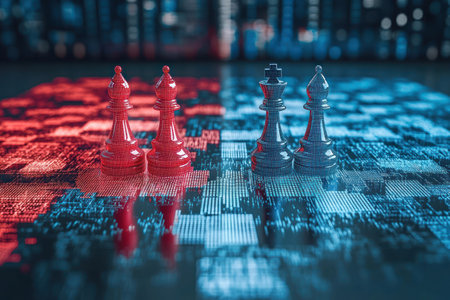 This image presents an abstract geometric pattern composed of intersecting red and blue lines against a dark backdrop. The composition features a repeating diamond-shaped grid, with a clear division between the two color zones. The style suggests a modern or digital aesthetic, suitable for diverse commercial applications.