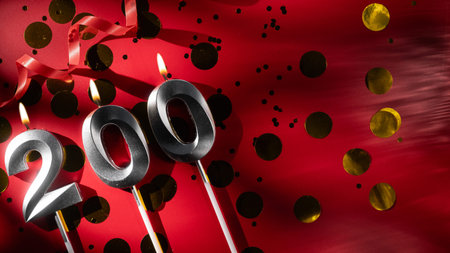 200 online community fans. Birthday burning candle number 200 on red background. Two hundred followers subscriber card. Template for blog and social networks. copy space