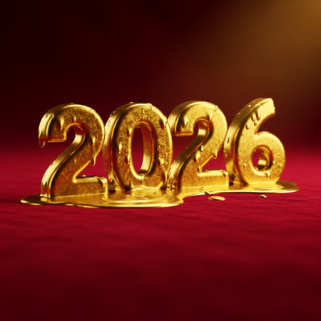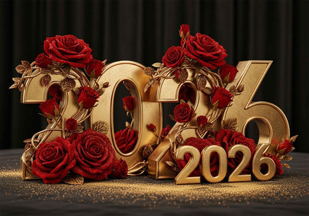 Golden digits 2026 are elegantly positioned on plush red fabric, showcasing a vibrant and festive ambiance for celebrations