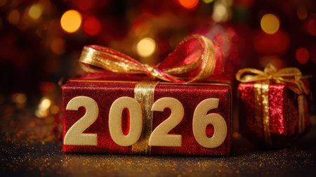 A beautifully wrapped gift box marked 2026 stands out among festive decorations symbolizing hope and celebration as New Year approaches.