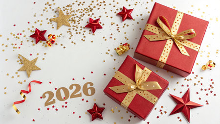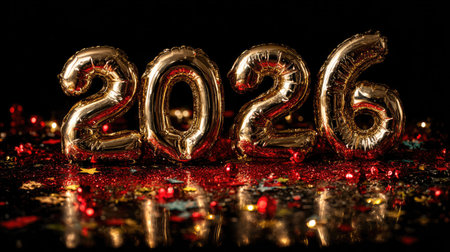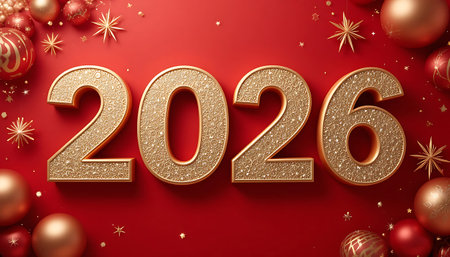 A vibrant representation of the year 2026 captured in golden glittery numbers atop a bright red confetti background, creating an engaging festive atmosphere for celebrations.