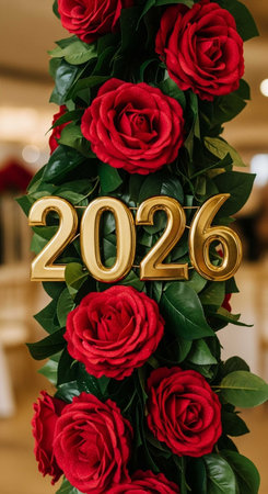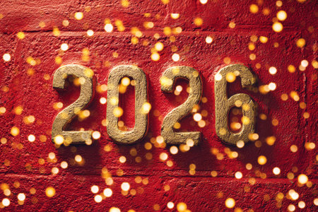 Golden digits 2026 displayed on a vibrant red wall, surrounded by shimmering bokeh lights, creating a festive atmosphere
