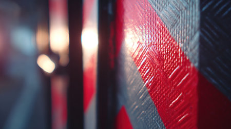 An abstract composition displays a textured surface with diagonal red stripes against a grey backdrop. The focus is on the intricate pattern, while background elements are blurred, suggesting a shallow depth of field. The scene evokes a sense of industrial design and could be suitable for various commercial applications.