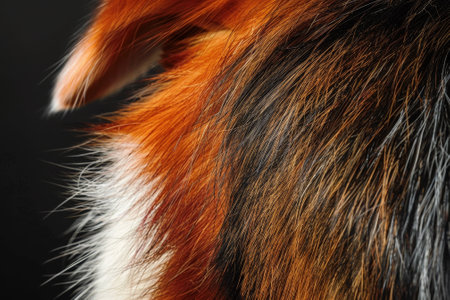 Closeup top view of fluffy texture of colorful real fox animal fur. Natural furry background. Horizontal color photography.