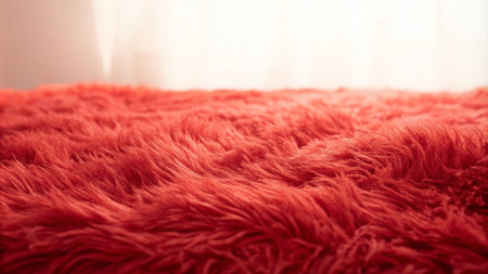 Warm and cozy red fluffy textured rug in sunlit room interior design.