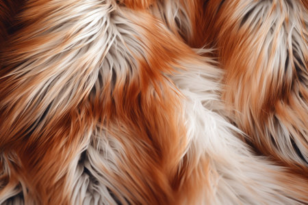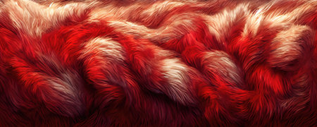 3d render digital background wallpaper of red and white animal fur coat. Warm and soft decorative natural material. Closeup of red fur texture with individual hairs. Fluffy and wavy textured fur coat.
