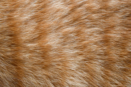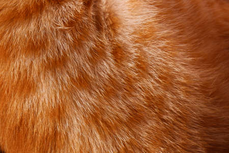 Bright red animal fur texture closeup. Furry back of ginger tabby cat. Animal hair fibers