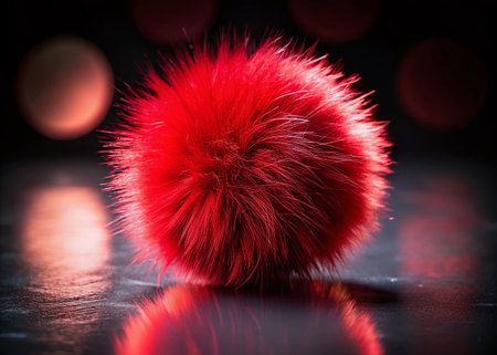 Red Rabbit Fur Pompom Close-up with Bokeh, Soft Fluffy Texture, Isolated on Black