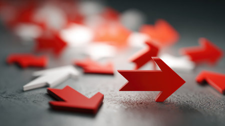 An abstract arrangement of vibrant red and white arrows scattered across a textured surface, symbolizing movement and direction in a creative composition.
