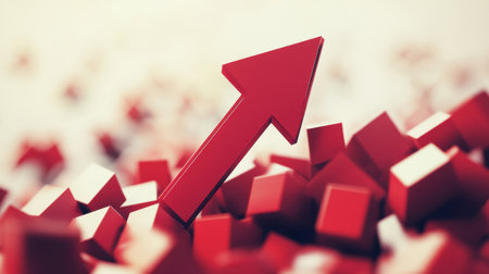 This striking image features a red arrow pointing upward, surrounded by geometric shapes and fragments, ideal for symbolizing growth and success in business.