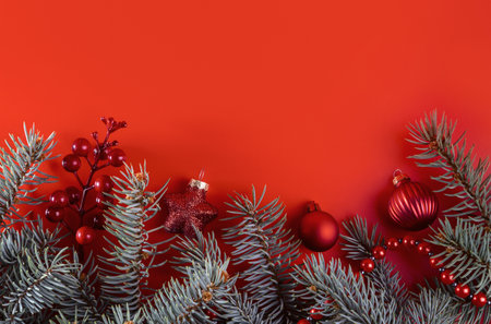 An overhead shot reveals Christmas ornaments nestled among evergreen branches against a vibrant red backdrop. The composition features a textured appearance with spherical decorations. This festive image suggests potential use in holiday-themed advertisements, editorial content, and various design projects, ideal for adding seasonal visuals.