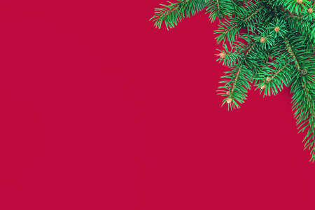 Flat lay, copy space. Green Christmas tree branch on an empty solid red background. Branch frame. New Year and Christmas concept.