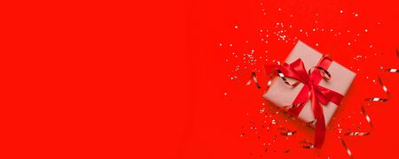 Surprise or gift box with red silk ribbon bow on a red background with copyspace