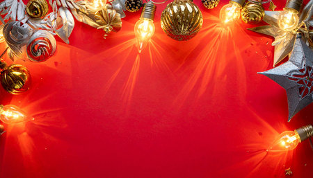 Beautiful festive red background with sparkles and Christmas golden toys. Holiday Content