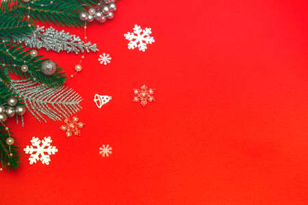 Top view of a flat lay of Christmas decorations on a red background. Concept for postcard, announcement, banner. With copy space