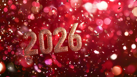 Glittering Red and Gold 2026 with Christmas Confetti. Concept of New Year Celebration, Festive Atmosphere, Holiday Sparkle, Glamorous Parties. Copy space.