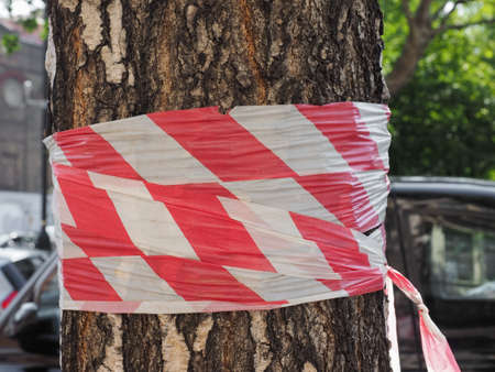 Red danger tape wrapped around a tree.
