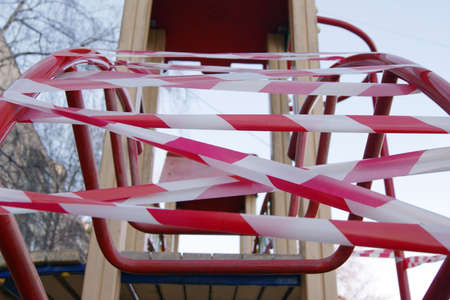White and red barrier tape in a playground, due to the quarantine restrictions activated to combat the Coronavirus pandemic.