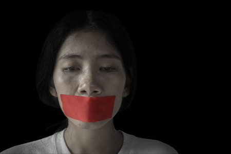 Picture of Asian woman looks desperate with her mouth covered by red tape