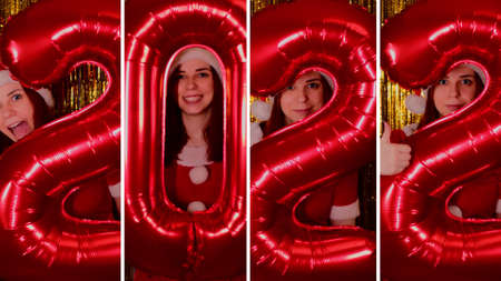 Split screen collage of emotional woman with red numeral figures. Happy female looking at camera through numbers. Concept of multiscreen montage and celebrating holidays in 2022.