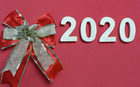 The inscription 2020 on a red Christmas background. Top view. Copy space. Flat lay.