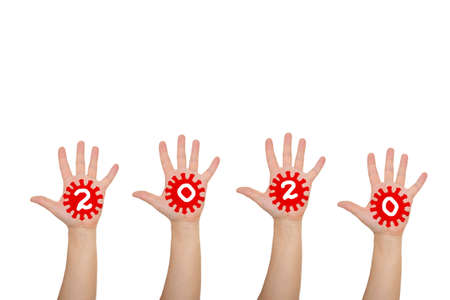 Number 2020 written on the coronavirus covid-19 painted hands. Transmission infection concept. Year of the battle with coronavirus. Isolated on a white background.