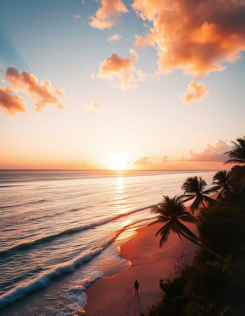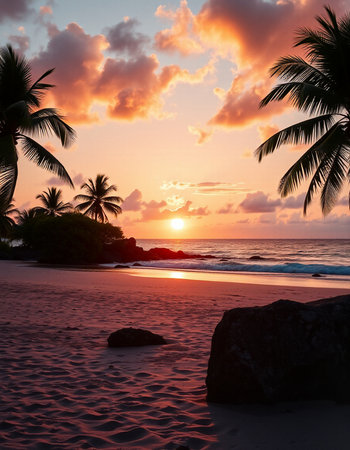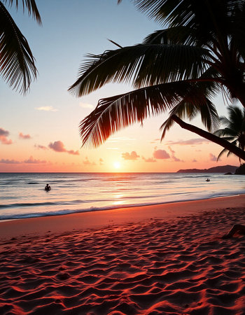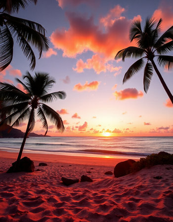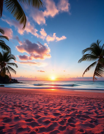 A scenic beach captures the eye with its vibrant colors. Palm trees frame the sandy shore, with reflections mirrored in the calm water. The composition is bathed in warm hues of orange and pink, possibly indicating a sunset. This image would be suitable for travel, tourism, or environmental themes.