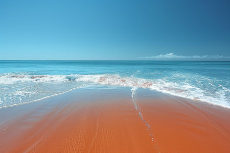 A serene tropical beach scene featuring a gradient of blue sky meeting the ocean, with soft waves lapping onto striking orange sand.