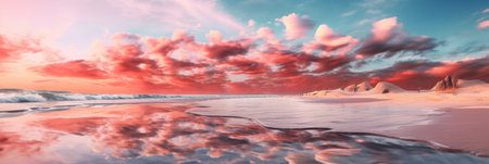 A serene coastal scene at dusk with a colorful sky mirrored on the receding tide, creating a beautiful and peaceful waterscape with gentle waves washing ashore.