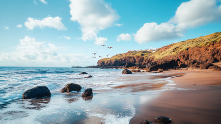 Captivating beach landscape featuring gentle waves lapping against a serene shoreline during sunset. Ideal for travel, nature, and relaxation themes.
