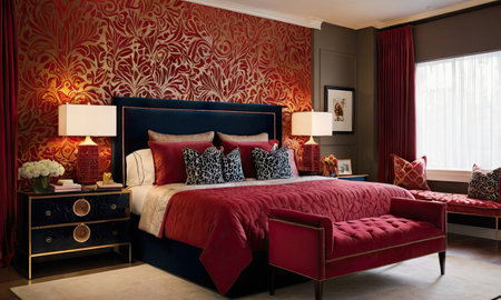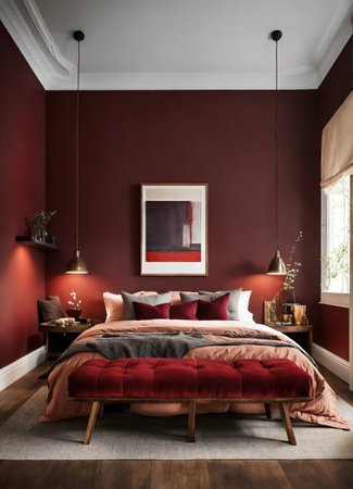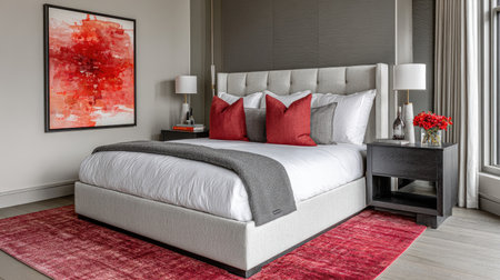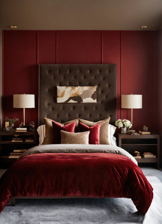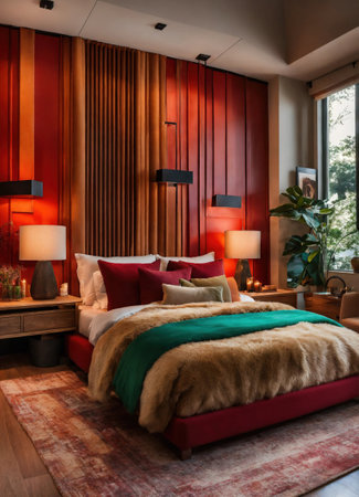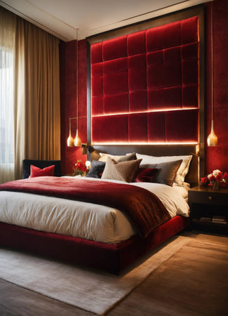A stylish bedroom showcases a large bed adorned with red bedding, set against a backdrop of dark paneled walls. The composition is enhanced by natural light streaming through a large window, complemented by subtle decorative elements. This image is suitable for use in interior design publications and commercial applications.