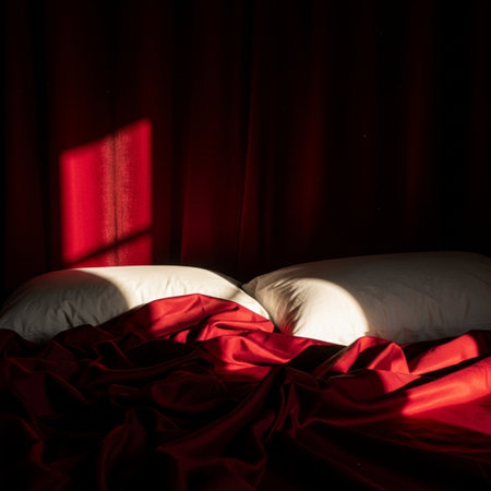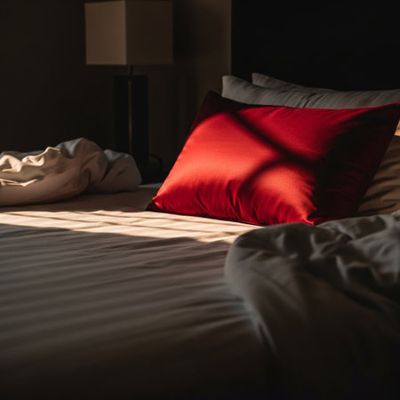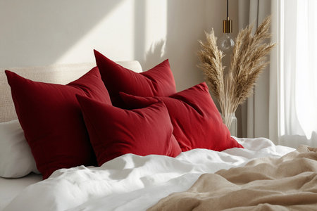 Plush red pillows are artfully arranged atop a minimalist Scandinavian bed, harmonizing with soft linens and gentle lighting that creates a serene and inviting atmosphere for relaxation.